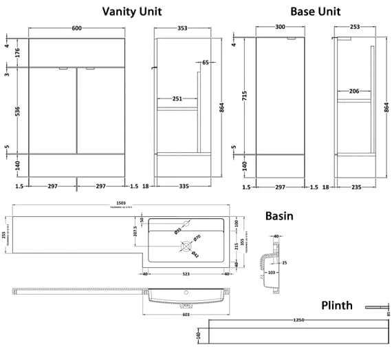 - The product consists of Vanity Unit, 3 x Base Unit, Plinth and Basin.