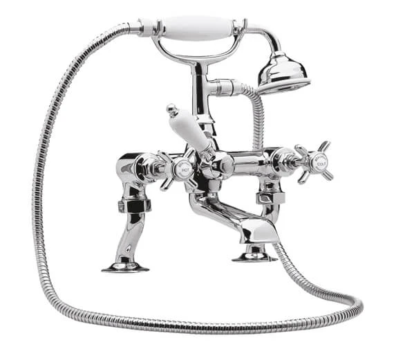 This Nuie Bathroom Beaumont Luxury Bath Shower Mixer is sure to become the centre of attraction in the bathroom. Finished in exclusive lustrous chrome polish, this deck-mounted tap features twin crosshead handles and a central ceramic handle. It comes included with a telephone handset, hose and cradle for your convenience. The crosshead levers on either side of the stylish central spout are crafted for efficiency and elegance. This flow-regulator compatible tap is fabricated from fine quality material and is backed by a 5-year guarantee from the manufacturer.