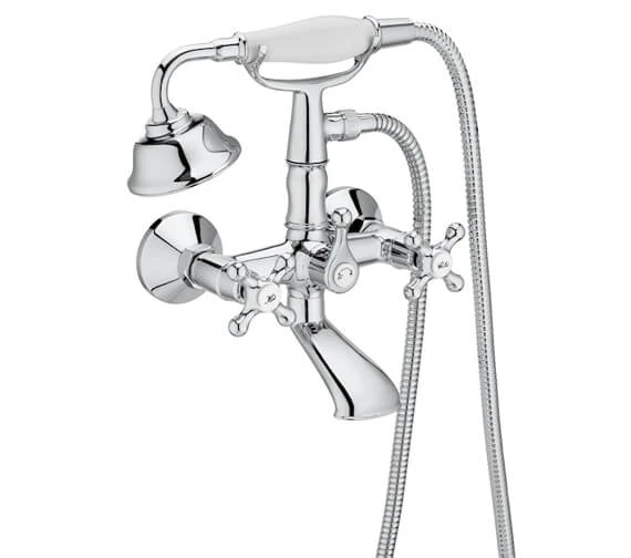 Roca Carmen Bath Shower Mixer Tap with Kit will functionally complete your powder room or bathroom. The fixture features a traditional design with crosshead levers and attaches to the wall to perform elegantly. The mixer is made out of strong brass that is incredibly strong and easy to clean and needs two holes for firm fixing. It includes a shower kit and comes with five years of guarantee from the manufacturer.
