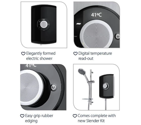 Triton Amore Electric Shower With Touch Control is all you need for perfect relaxing showering. Easy to use and a great clean design makes it a simple yet stylish addition to compliment your bathroom. Available in many finishes and variations, it comes with a rail length of 530mm, a Hose length of 1500mm and a rail diameter of 22mm. It has a push-button on/off so you can leave the power and temperature controls at your preferred setting; it also features a low-pressure indicator. Supplied with a showerhead with five spray patterns, it is compatible for use with mains cold supply systems. BEAB, CE, BSI Kitemark, WRAS approved, it is backed by two years of guarantee against any manufacturing defects.